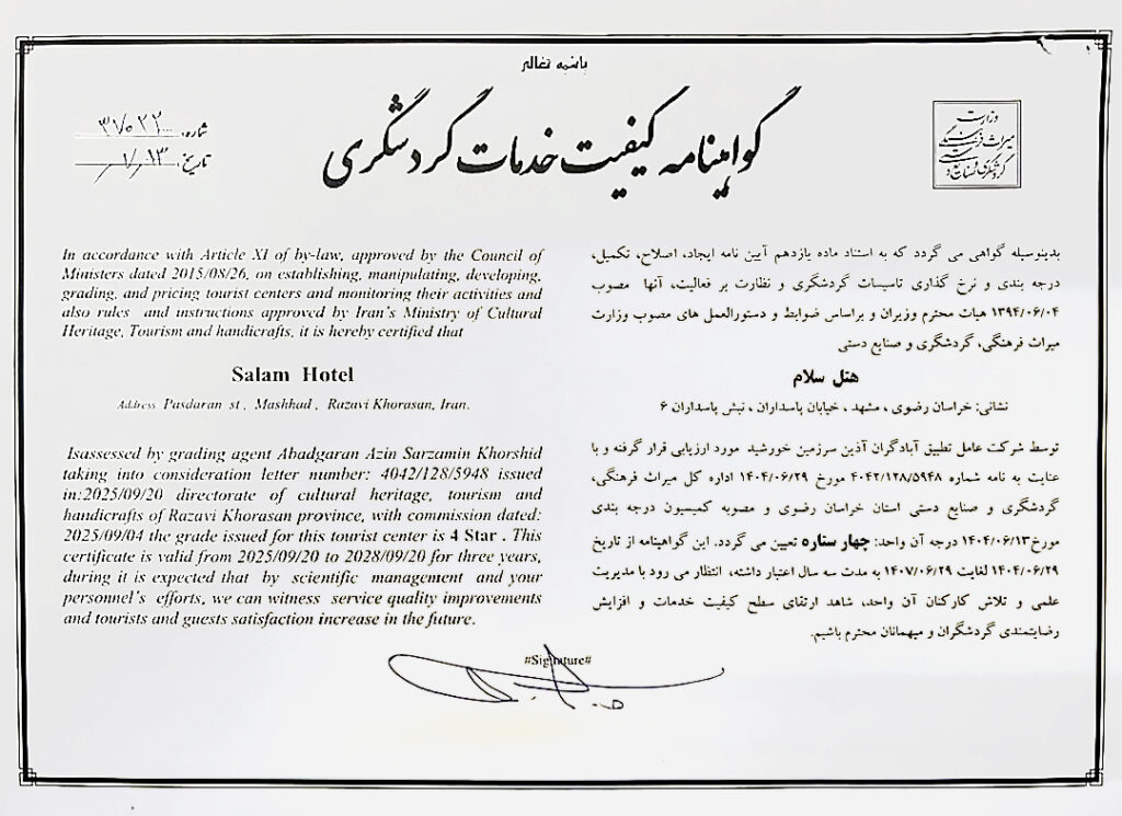 دریافت این گواهینامه، نشاندهندهی تعهد مدیریت و کارکنان هتل سلام مشهد به ارتقای سطح خدمات اقامتی و پذیرایی، رعایت اصول حرفهای صنعت هتلداری و حرکت در مسیر توسعه پایدار گردشگری است.